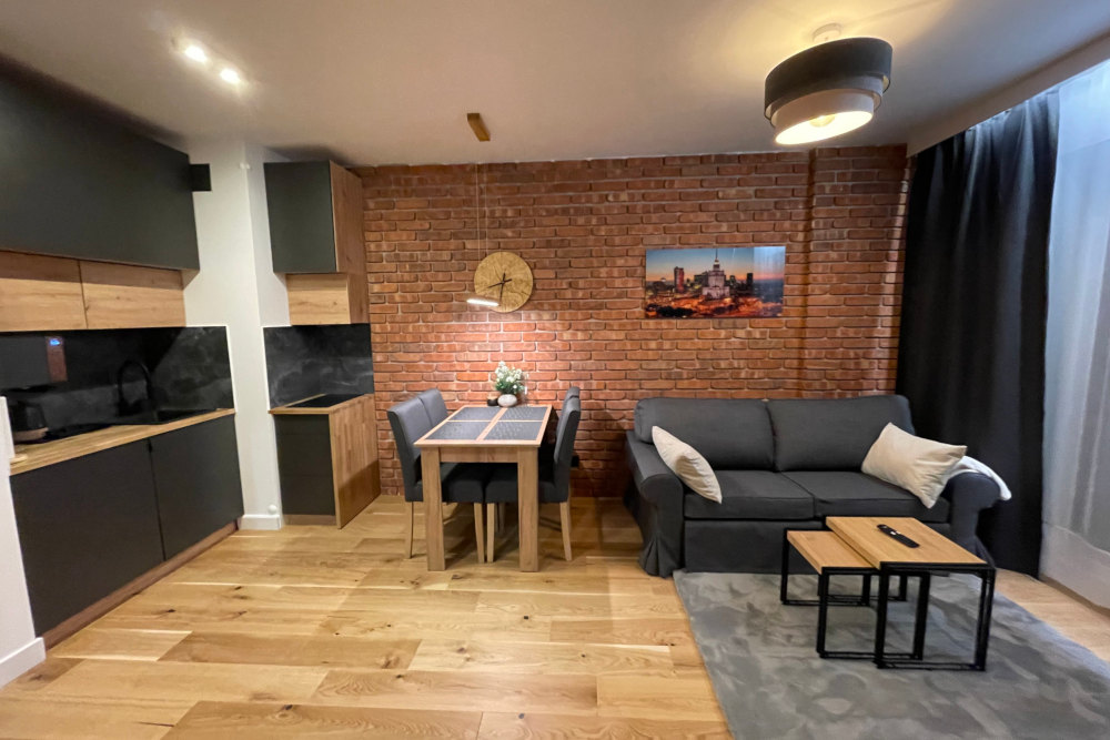 The apartment consists of a living room with a kitchen, a bedroom, and a bathroom. It is located close to the M1 Politechnika metro station, the historic Zbawiciela Square, Constitution Square, the Palace of Culture and Science, and the Royal Łazienki Park.